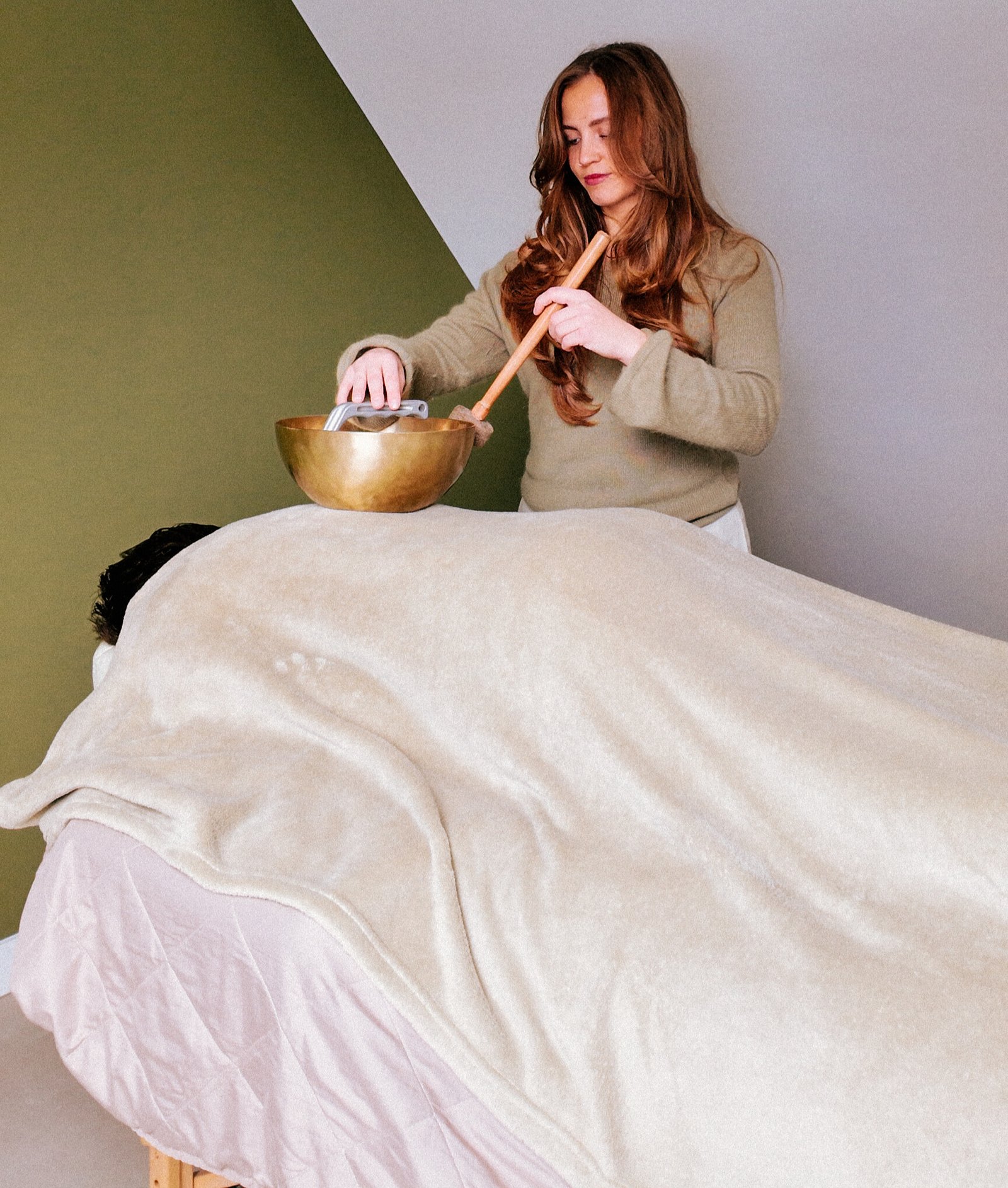 – Ik beweeg op zachte wijze met een klankschaal over delen van je lichaam.